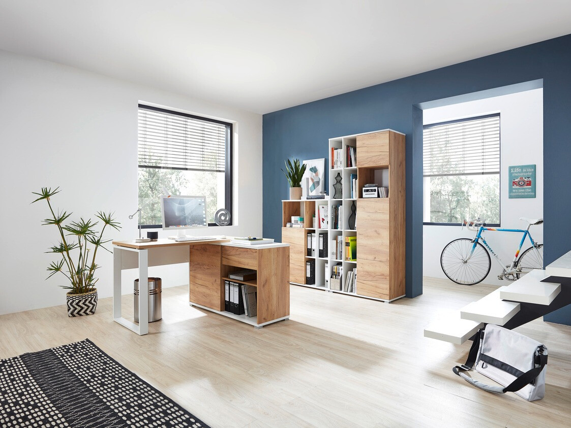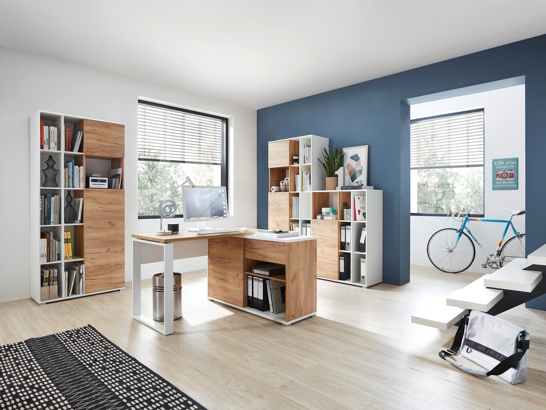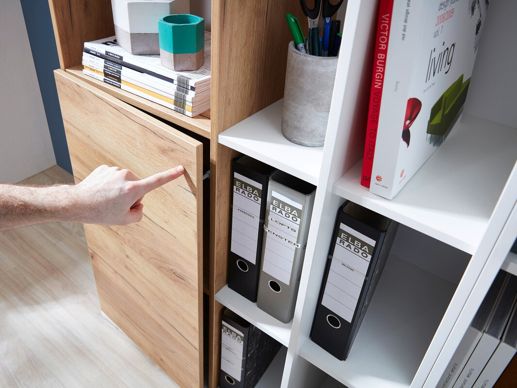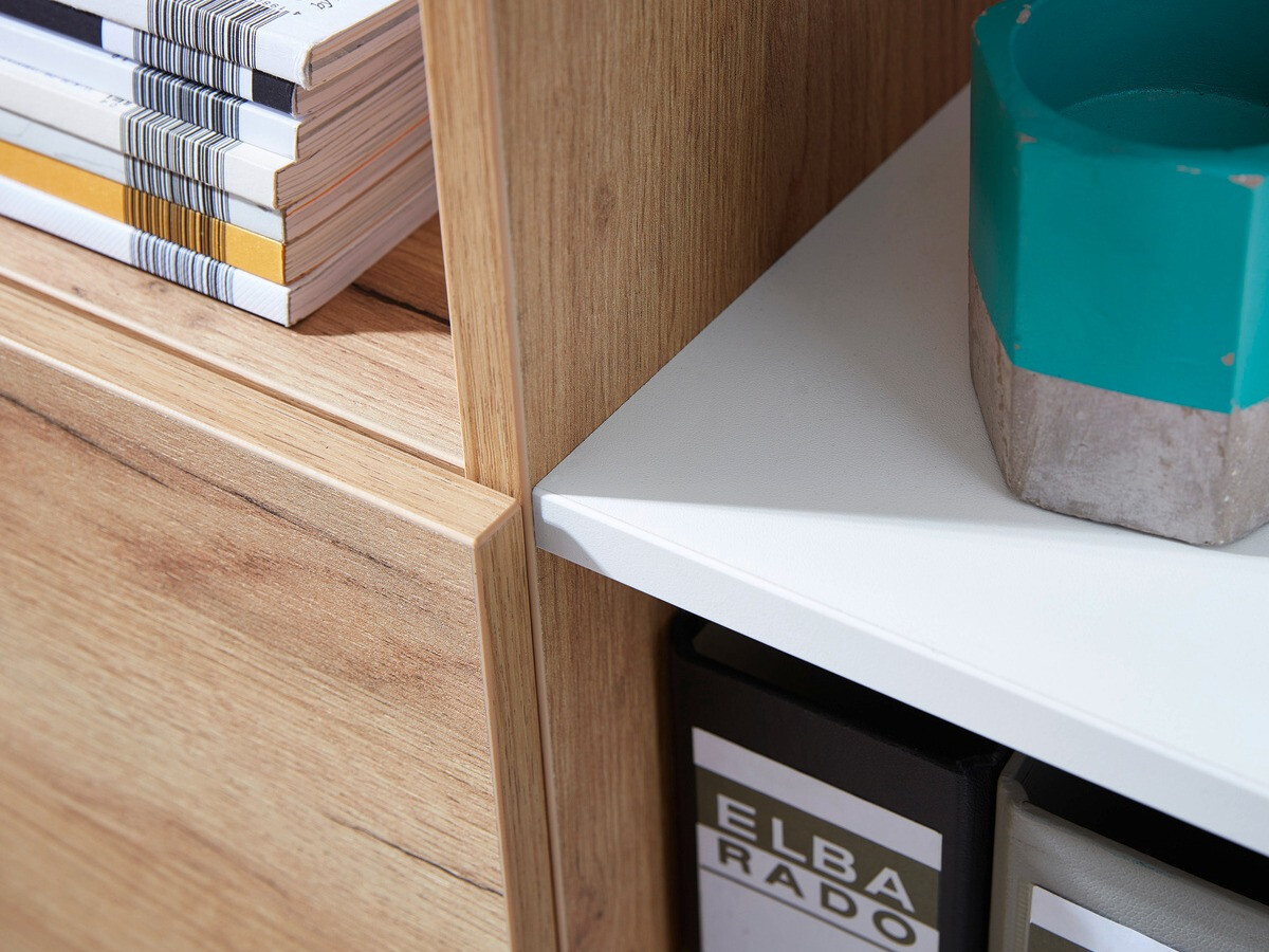 Die Büromöbelkollektion im skandinavischen Stil wird jeden Fan von minimalistischem Design begeistern. Die vorherrschende weiße Farbe wird durch Fronten in Eichenholzoptik „Navarra“ ergänzt. Die Möbel sind leicht zu pflegen, da sie mit einem farblosen Material überzogen sind, das vor kleinen Kratzern schützt und eine einfache Reinigung von angesammeltem Schmutz ermöglicht. Die Kanten der Möbelkollektion sind mit einer Zierleiste versehen. Sie bestehen aus stabilem Kunststoff, der die Möbel vor kleinen Beschädigungen schützt. Funktionalität und Bequemlichkeit sind wesentliche Merkmale dieser in Deutschland hergestellten Kollektion. Die Schubladen und Türen haben einen „Push-to-Open“-Öffnungsmechanismus. Dieser Mechanismus ermöglicht es Ihnen, Türen und Schubladen mit einem Klick zu öffnen. Schaffen Sie mit dieser Kollektion ein harmonisches Arbeitsumfeld.