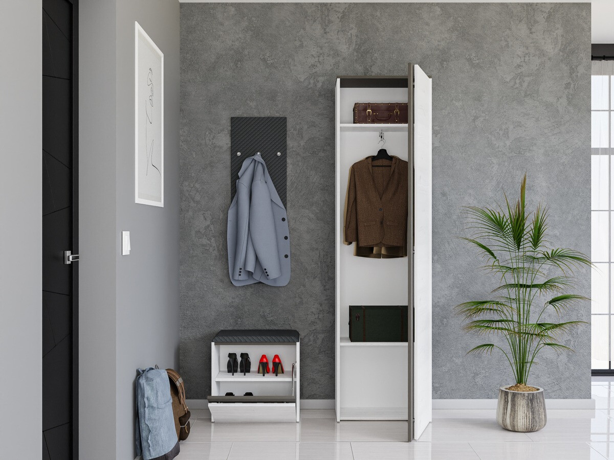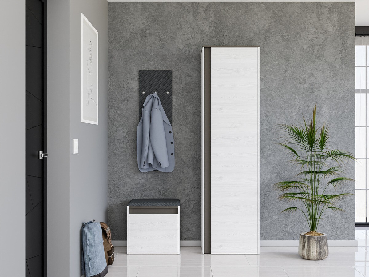 Eine Flurmöbelkollektion, die diesem Raum Funktionalität, Eleganz und Modernität verleiht. Die Möbel dieser Kollektion zeichnen sich nicht nur durch ihr ästhetisches Design, sondern auch durch praktische Eigenschaften aus. Jedes Möbelstück verfügt über geschützte Kanten, die dafür sorgen, dass die Möbel im täglichen Gebrauch langlebig sind. Darüber hinaus verfügen die Möbel der Kollektion über versteckte Griffe, die sich subtil in das Gesamtdesign einfügen und einen Hauch von Modernität verleihen. Die Frische der Kollektion spiegelt sich auch in der Kombination der Anthrazit- und Weißkieferfarben wider, die ein Gefühl von Wärme und Natürlichkeit erzeugen. Dies ist eine ausgezeichnete Wahl für diejenigen, die einen gemütlichen und einladenden Flur schaffen möchten, der auch ihren einzigartigen Geschmack und Stil widerspiegelt.