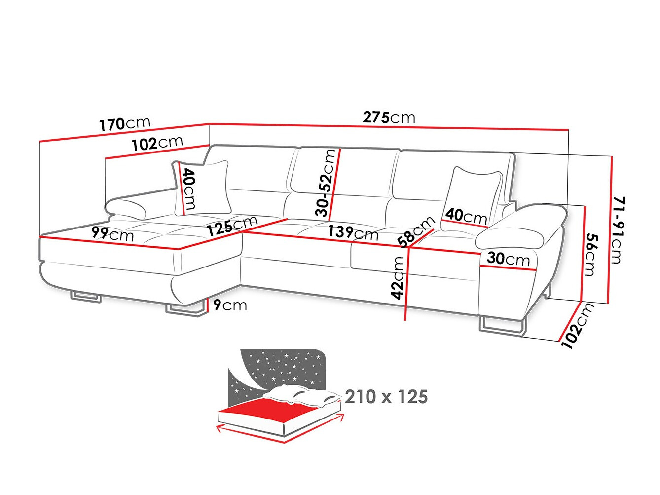 Wenn Sie das Sofa von vorne betrachten, befindet sich der verlängerte Teil bzw. die Ecke der linksseitigen Option auf Ihrer linken Seite. Die gewählte Eckoption sollte den Fluss des Raums verbessern und eine einfache Bewegung innerhalb des Raums ermöglichen.