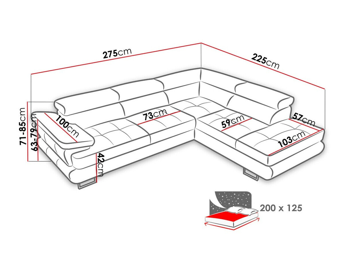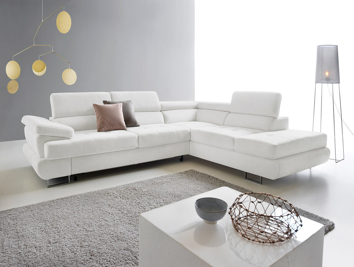 Wenn Sie das Sofa von vorne betrachten, befindet sich der verlängerte Teil bzw. die Ecke der rechtsseitigen Option auf Ihrer rechten Seite. Die gewählte Eckoption sollte den Fluss des Raums verbessern und eine einfache Bewegung innerhalb des Raums ermöglichen.