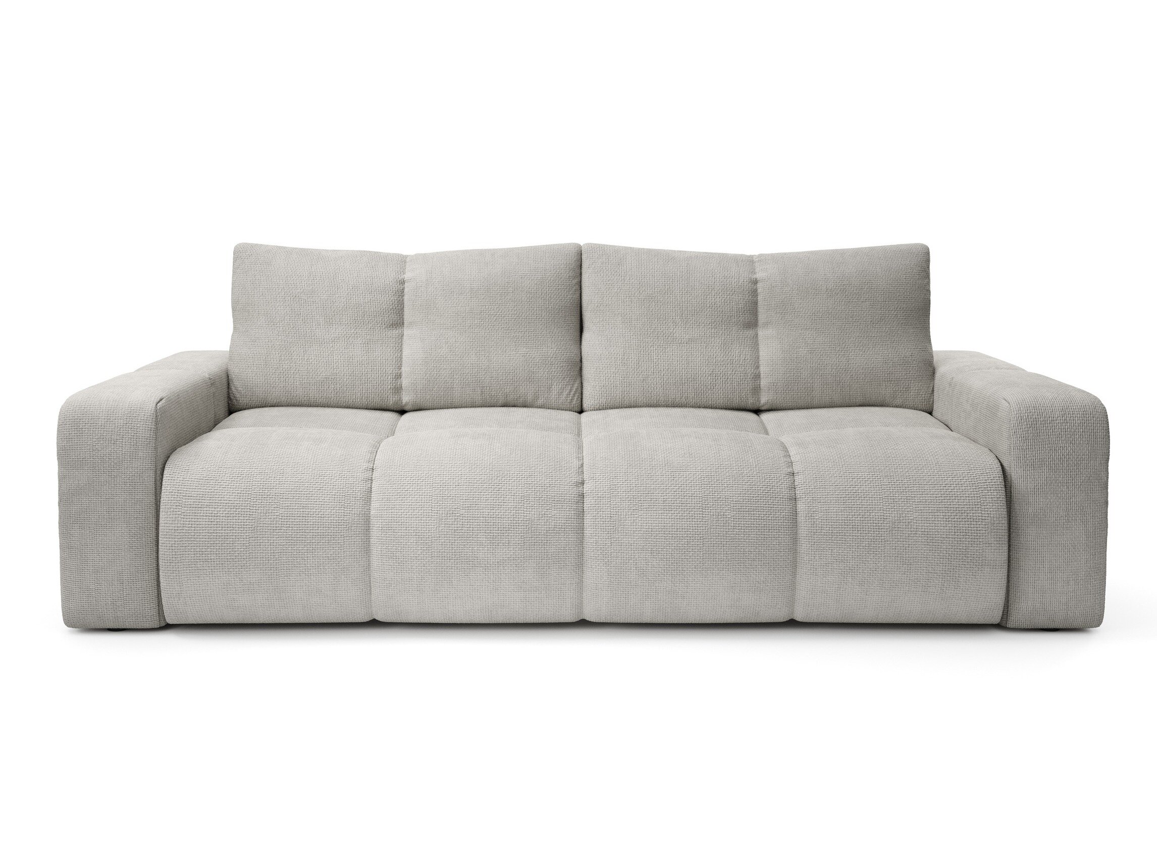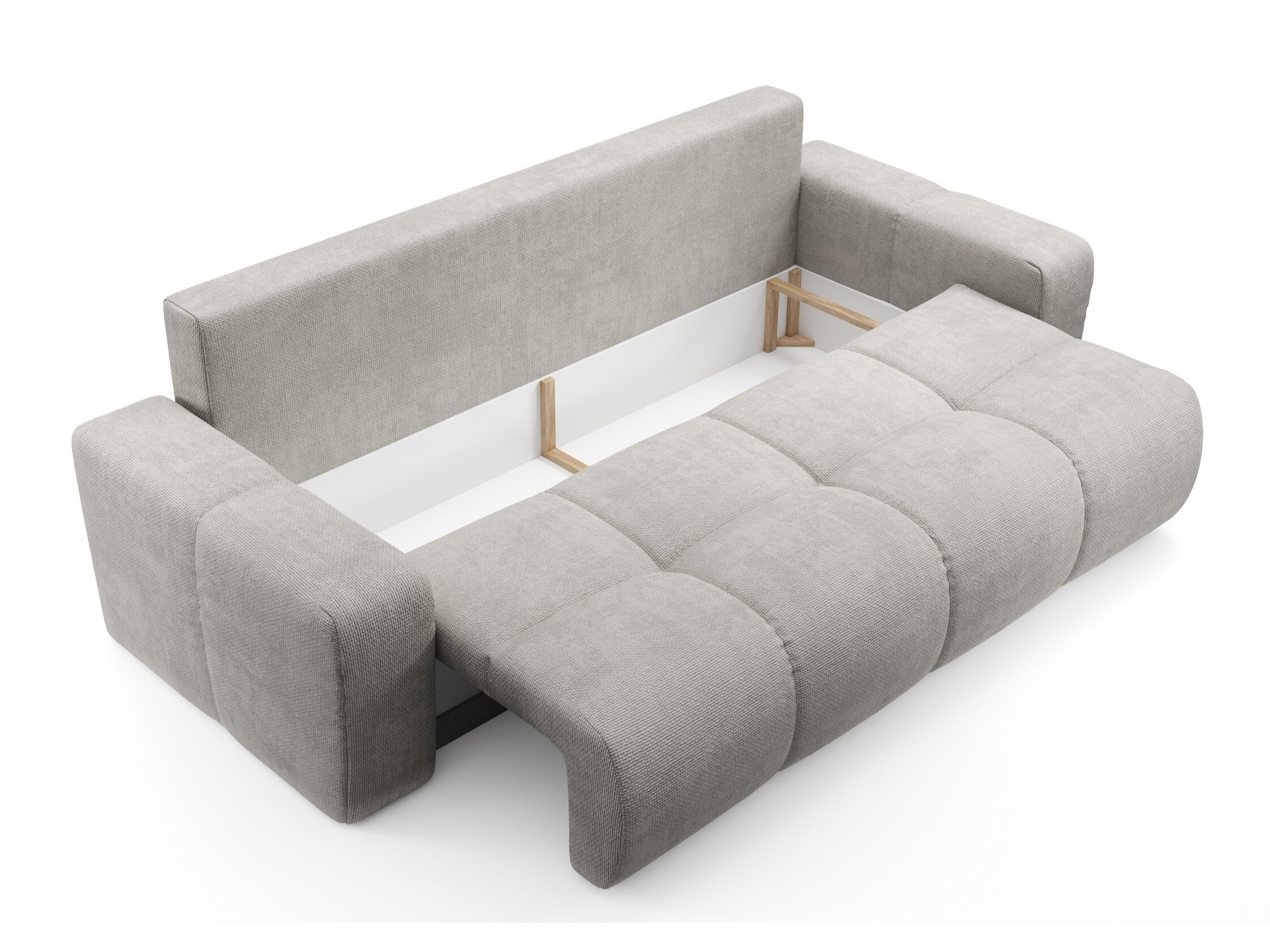 Es handelt sich um eine einfache und bequeme Lösung, mit der Sie das Möbelstück ohne großen Aufwand umbauen können. Die Schublade unter dem Sitz ist unsichtbar, und wenn sie herausgezogen wird, kann das Möbelstück zu einem großartigen Schlafplatz werden. Um das Möbel aufzuklappen, ziehen Sie einfach den unteren Teil zu sich heran und ziehen Sie die Schublade mit der zusätzlichen Schlaffläche heraus. Verwenden Sie die Schlaufe, um die Matratze darin anzuheben. Dieser Schlafbereich ist etwas steifer als üblich. Da sich der hintere Teil nicht bewegt, können Möbel mit diesem Mechanismus direkt an die Wand gestellt werden.